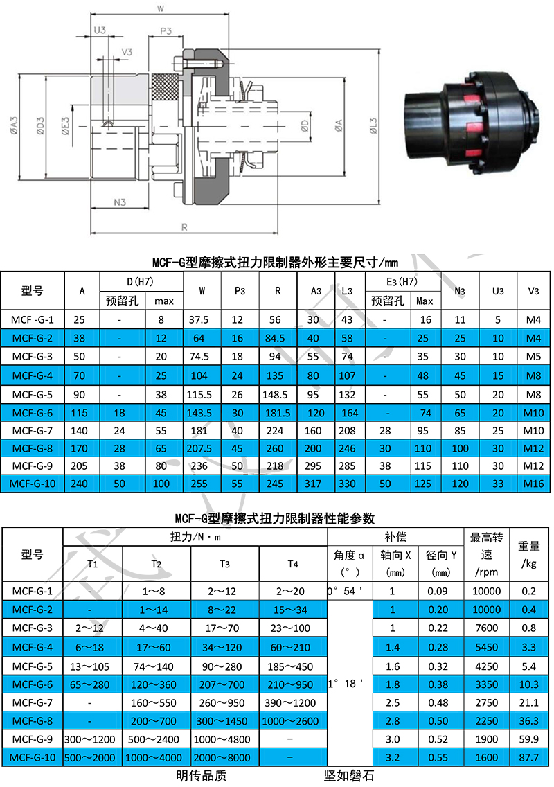 1.標準摩擦扭矩限制器配彈性聯軸器,方便軸與軸的連接,具有一定的偏心補償功能,同時也有良好的吸震性。