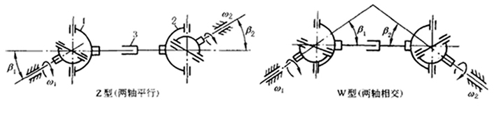 萬向聯軸器的安裝形式按其軸線相互位置,一般分Z型(兩軸平行)和W型(兩軸相交),見下圖。
